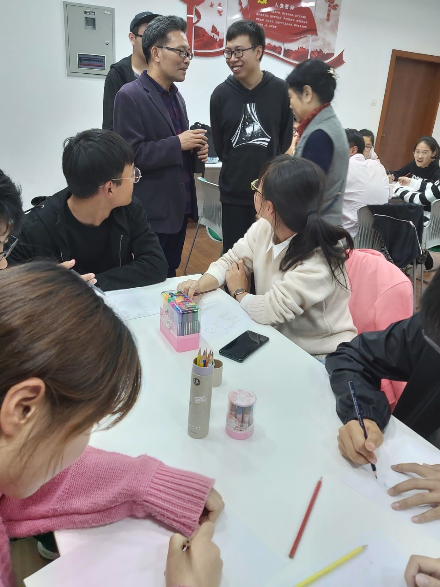 第三个环节是“绘时光”,在这个过程中,同学们利用活动室的彩笔,画出了自己四年前的生活。在接下来同学之间的分享中,同学们收获了欢声笑语,增进了互相之间的了解,活动室里一片欢声笑语。