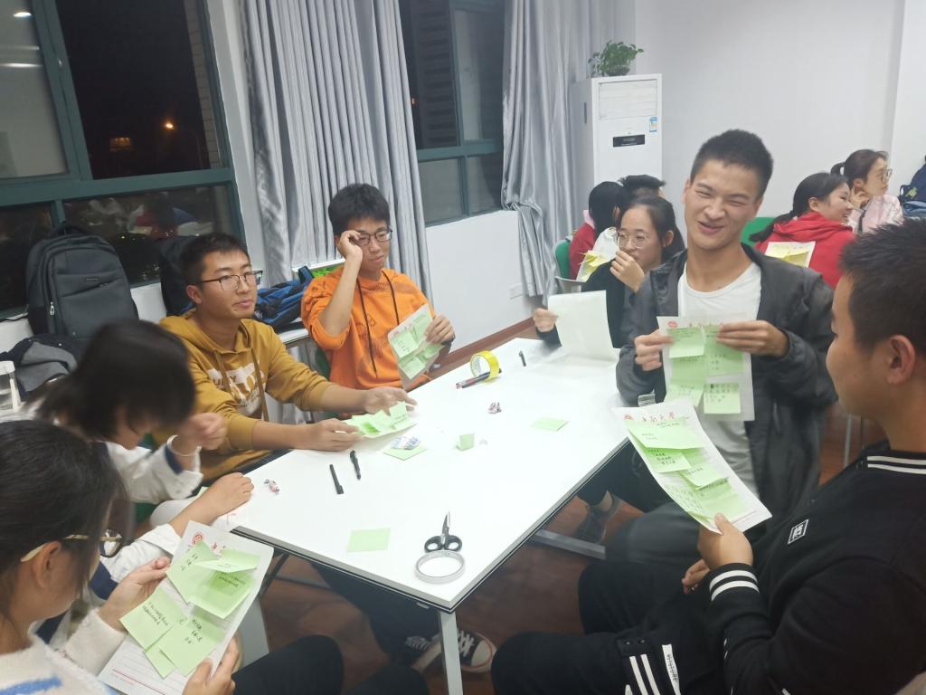 随后,辅导员组织同学们站成俩圈,圈内圈外的同学互相捶背。接着玩了一个扎马步的游戏,游戏中,一个接一个地坐在彼此身上,最后形成一个圈。在游戏中同学们体会到了信任与互助的重要性。接着是随机分组环节。报数完毕后,同学们一共分成了四组。在辅导员的带领下,同学们写下了心灵契约--开心、愉快、自由、放松和保密。就这样,数物1909班的团体辅导正式拉开帷幕。