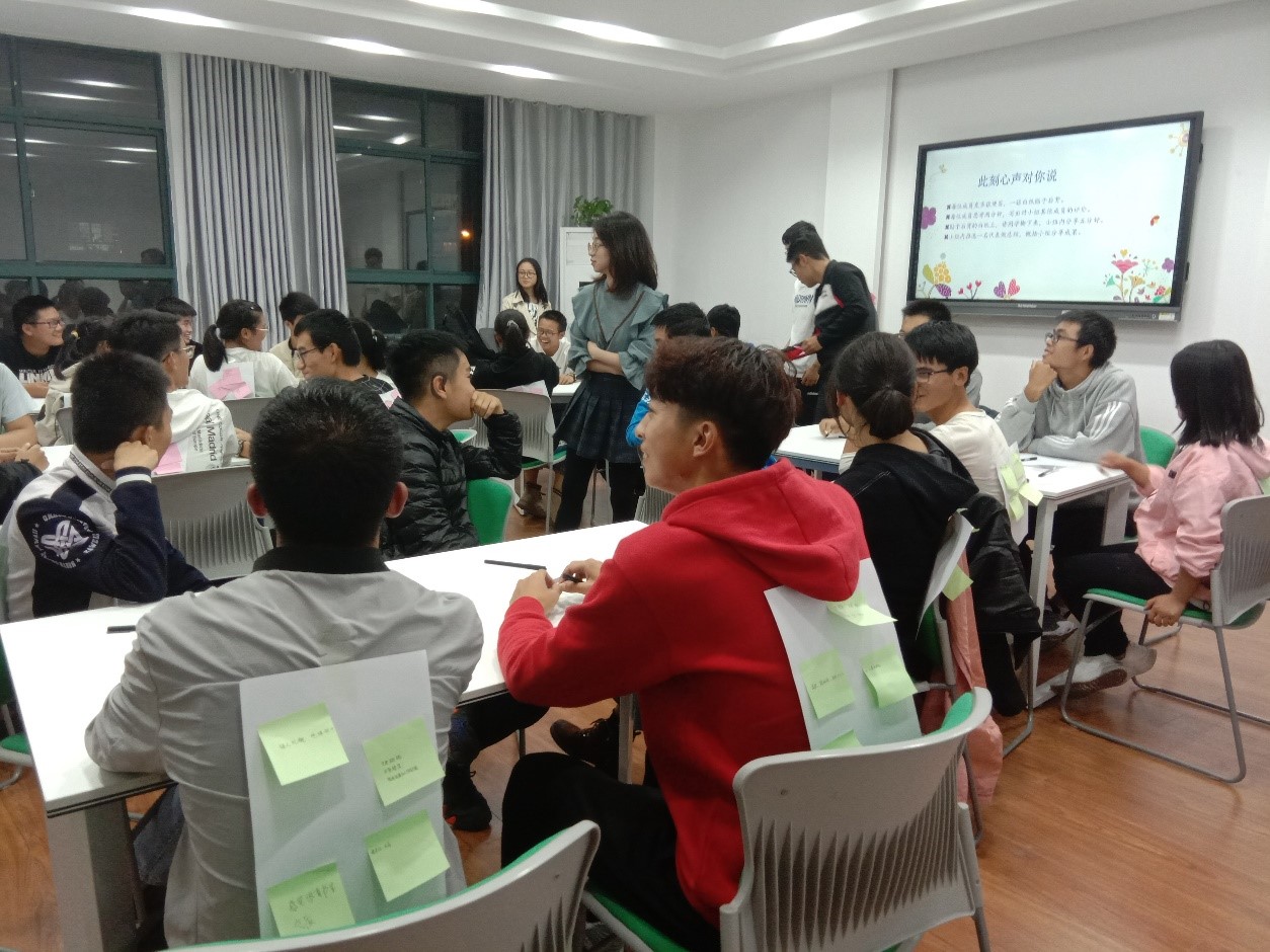 首先,薛老师组织了热身活动——同学们相互按摩。热身不仅能够让同学们在一天紧张的学习生活后放松身心,让所有同学更好的融入本次活动中;还能让同学们构建良好的关系,增强班级的凝聚力。热身完毕后,薛老师又组织分组并写下了本次辅导的“心灵契约”—投入、无手机、愉悦、交流、包容、新体验。这也意味着本次团体辅导正式开始了!