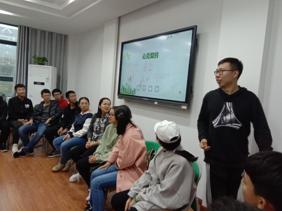 团辅开始前,王老师组织了热身活动,同学们互相捶背揉肩以放松心情。接着,同学们通过报数被分为四组。分组后,同学们一起写下了心灵契约——自由、高兴、放松、open,这代表着本次团辅正式开始。